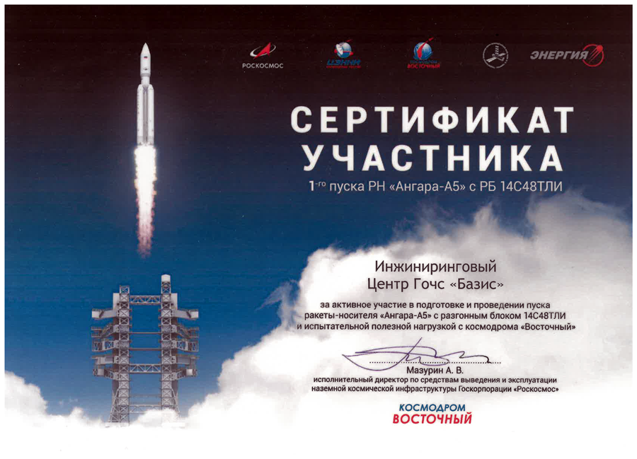 За активное участие в подготовке и проведении пуска ракеты-носителя «Ангара-А5» с разгонным блоком 14С48ТЛИ и испытательной полезной нагрузкой с космодрома «Восточный» ЗАО ИЦ ГОЧС «БАЗИС» получил сертификат от Госкорпорации «РОСКОСМОС».