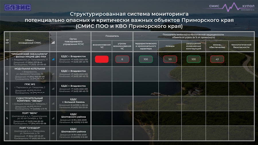 Представленная система предназначена для автоматического в режиме реального времени мониторинга чрезвычайных ситуаций, инженерно-технической защищенности потенциально опасных и критически важных объектов на территории Приморского края от угроз: